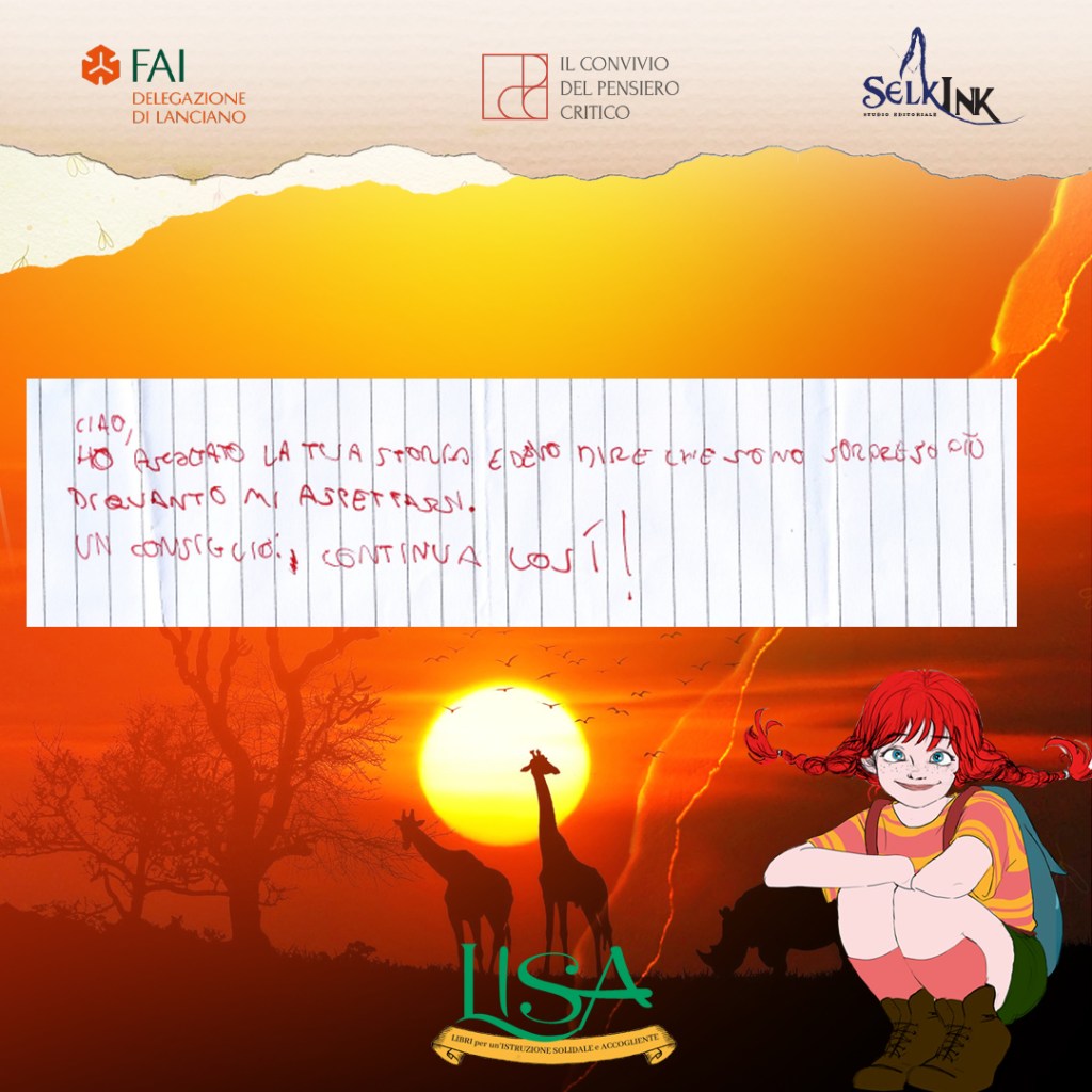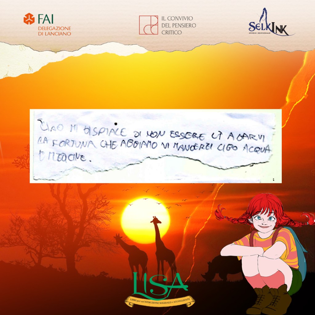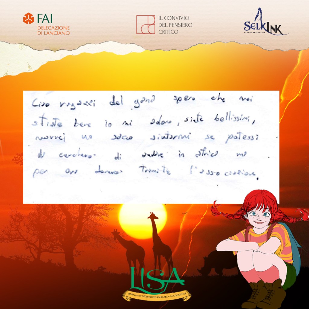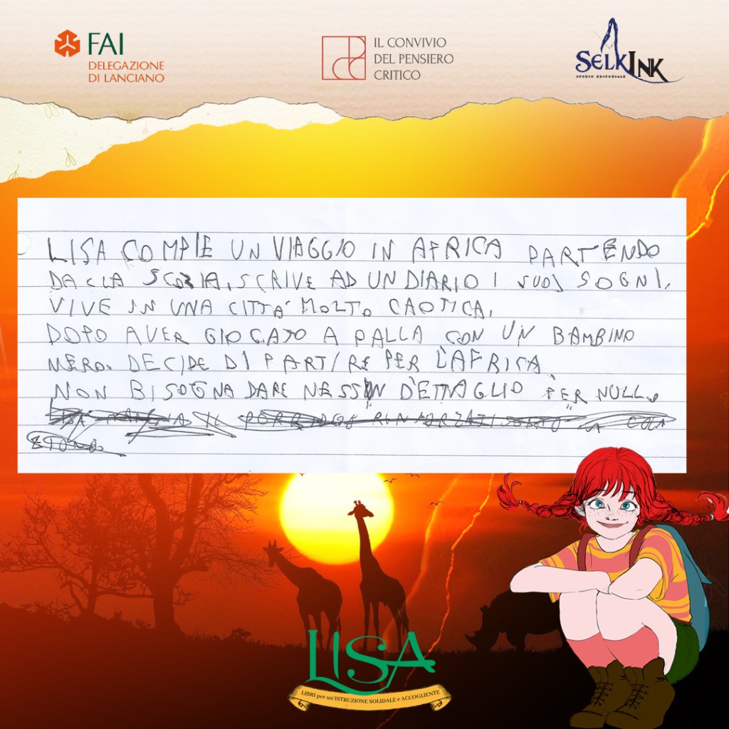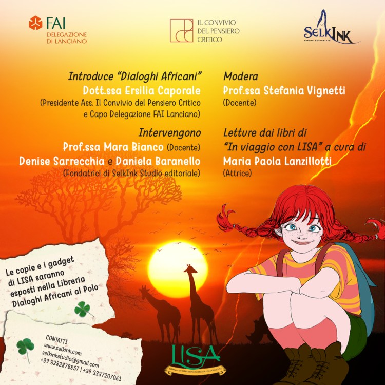 L’appuntamento è alle 10:30 presso la scuola “Umberto I” di Lanciano e vedrà l’introduzione della dott.ssa Ersilia Caporale, presidente dell’associazione “Il Convivio del Pensiero Critico” nonché capo della delegazione FAI di Lanciano, l’intervento della prof.ssa Mara Bianco, che dialogherà con noi di SelkInk per parlare del progetto LISA, e della prof.ssa Stefania Vignetti come moderatrice. Accompagnerà la presentazione la performance dell’attrice Maria Paola Lanzillotti, che leggerà alcuni estratti del primo libro In viaggio con LISA. Destinazione Ghana e del secondo, in uscita, In viaggio con LISA. Destinazione Malawi, in particolare il racconto del viaggio di Lisa, la protagonista della storia, e alcuni testi scritti dai ragazzi dei due Paesi africani coinvolti. Si darà poi spazio all’interazione con i ragazzi delle scuole presenti, che potranno fare domande e dare sfogo alla loro creatività e ai loro pensieri con scrittura di testi e realizzazione di disegni. Chi vorrà potrà poi fare un selfie con LISA sul posto.