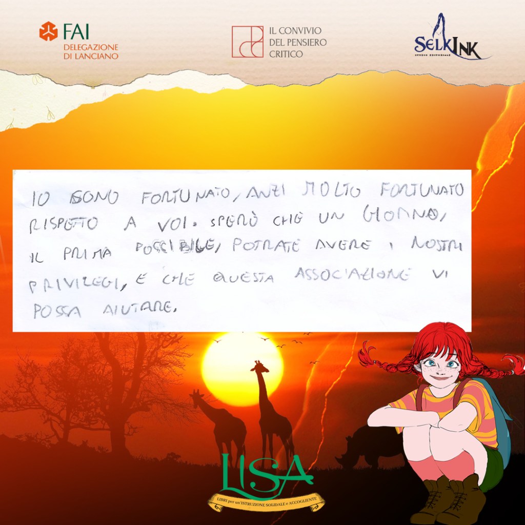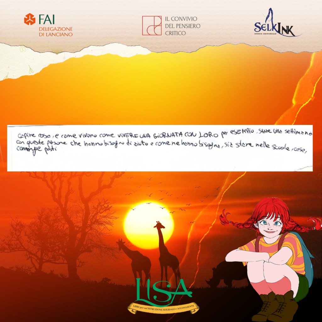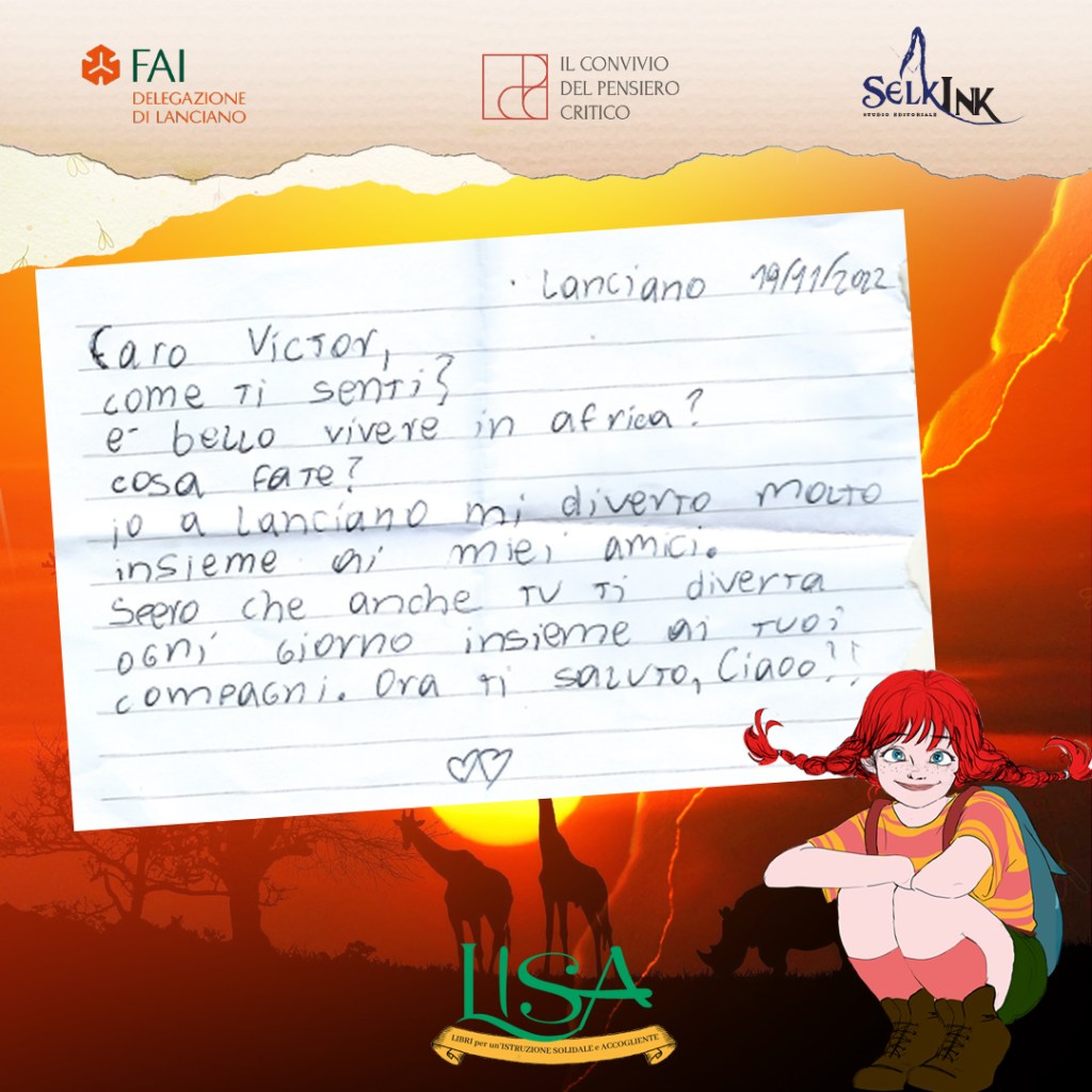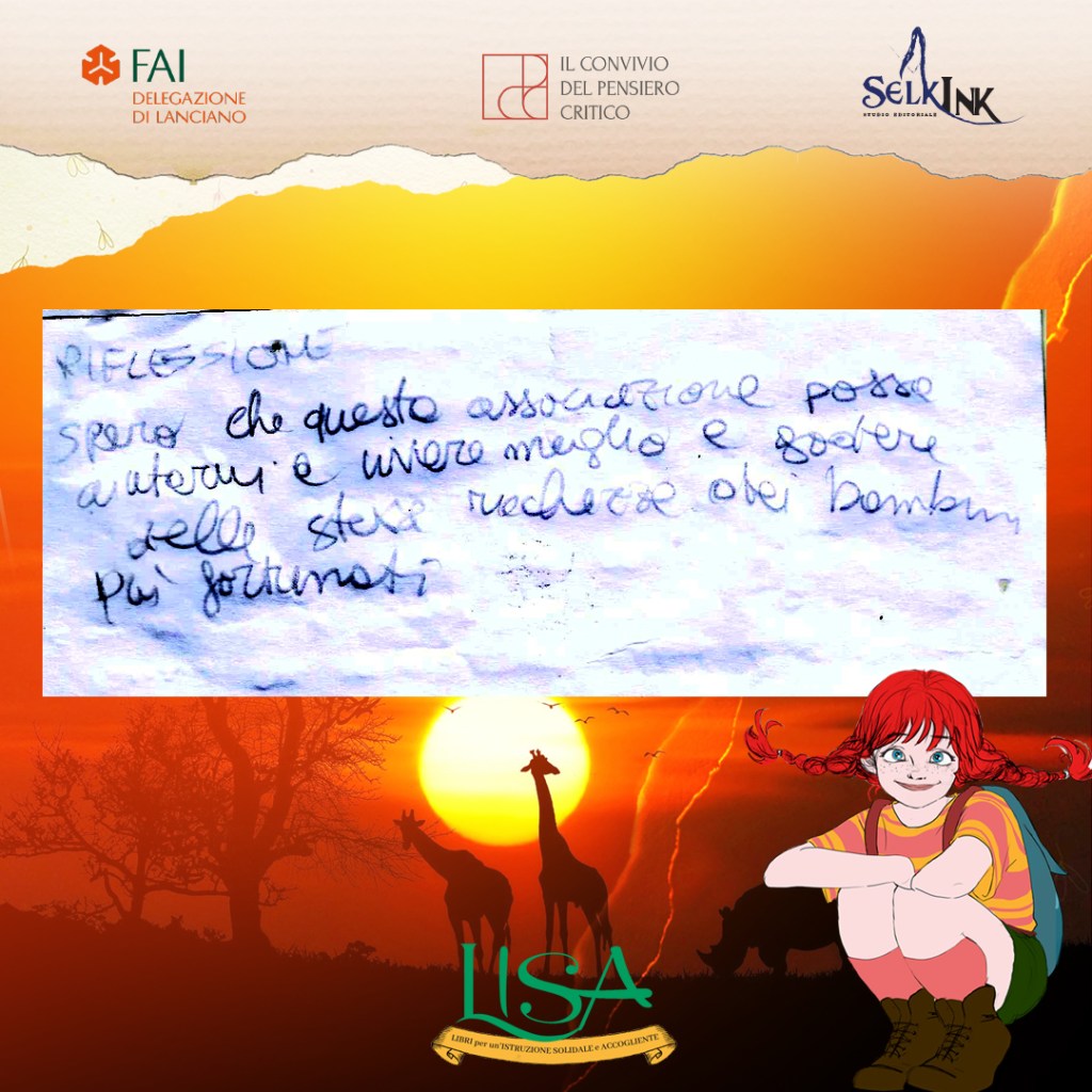 L’appuntamento è alle 10:30 presso la scuola “Umberto I” di Lanciano e vedrà l’introduzione della dott.ssa Ersilia Caporale, presidente dell’associazione “Il Convivio del Pensiero Critico” nonché capo della delegazione FAI di Lanciano, l’intervento della prof.ssa Mara Bianco, che dialogherà con noi di SelkInk per parlare del progetto LISA, e della prof.ssa Stefania Vignetti come moderatrice. Accompagnerà la presentazione la performance dell’attrice Maria Paola Lanzillotti, che leggerà alcuni estratti del primo libro In viaggio con LISA. Destinazione Ghana e del secondo, in uscita, In viaggio con LISA. Destinazione Malawi, in particolare il racconto del viaggio di Lisa, la protagonista della storia, e alcuni testi scritti dai ragazzi dei due Paesi africani coinvolti. Si darà poi spazio all’interazione con i ragazzi delle scuole presenti, che potranno fare domande e dare sfogo alla loro creatività e ai loro pensieri con scrittura di testi e realizzazione di disegni. Chi vorrà potrà poi fare un selfie con LISA sul posto.