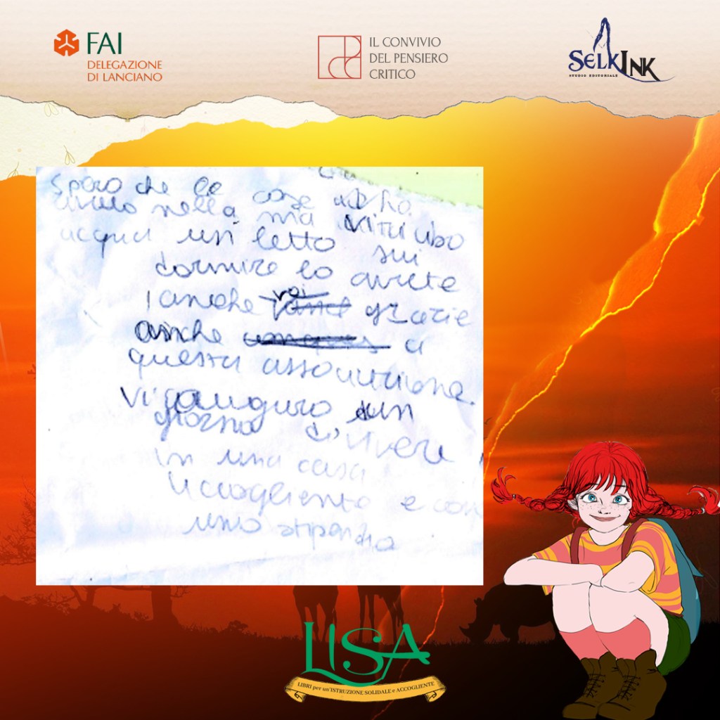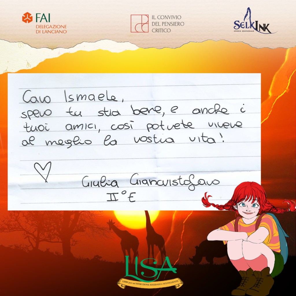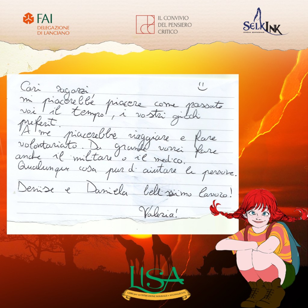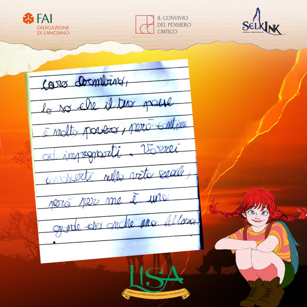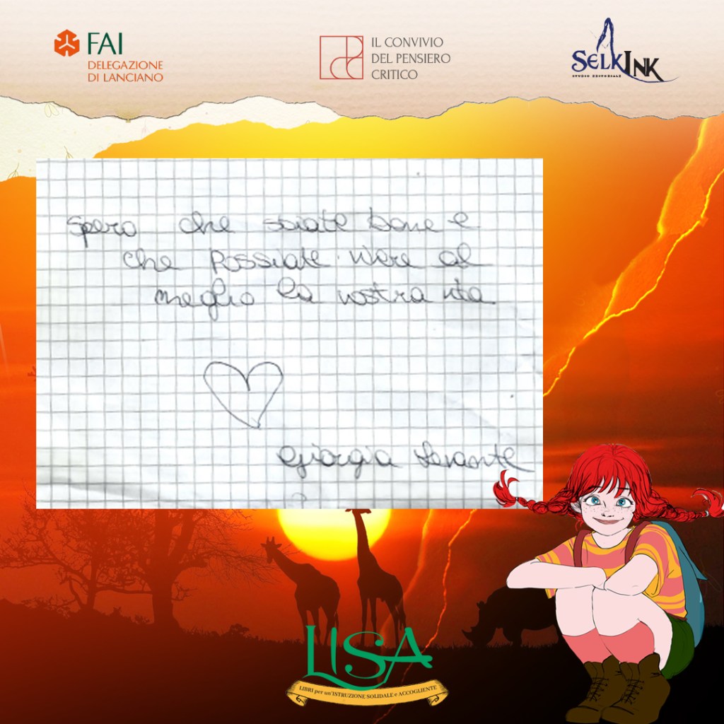 L’appuntamento è alle 10:30 presso la scuola “Umberto I” di Lanciano e vedrà l’introduzione della dott.ssa Ersilia Caporale, presidente dell’associazione “Il Convivio del Pensiero Critico” nonché capo della delegazione FAI di Lanciano, l’intervento della prof.ssa Mara Bianco, che dialogherà con noi di SelkInk per parlare del progetto LISA, e della prof.ssa Stefania Vignetti come moderatrice. Accompagnerà la presentazione la performance dell’attrice Maria Paola Lanzillotti, che leggerà alcuni estratti del primo libro In viaggio con LISA. Destinazione Ghana e del secondo, in uscita, In viaggio con LISA. Destinazione Malawi, in particolare il racconto del viaggio di Lisa, la protagonista della storia, e alcuni testi scritti dai ragazzi dei due Paesi africani coinvolti. Si darà poi spazio all’interazione con i ragazzi delle scuole presenti, che potranno fare domande e dare sfogo alla loro creatività e ai loro pensieri con scrittura di testi e realizzazione di disegni. Chi vorrà potrà poi fare un selfie con LISA sul posto.